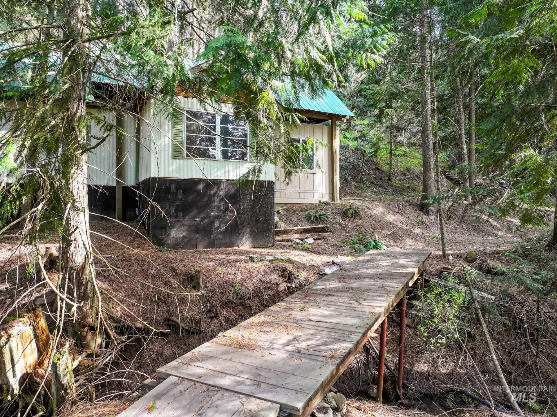 Tucked at the base of Moscow Mtn., this 2.097-acre wooded retreat offers privacy, natural beauty, & incredible potential. Located adjacent to Idlers Rest Park, property features mature timber, crystal-clear creek running through the land, while the steep hillside terrain enhances privacy, creating peaceful mountain setting. 2 charming wooden bridges provide access across creek to both yard & home. Property inc. 1971 single-wide (60x12, 720 sq ft); 2 beds & 1.5 baths that is functional but in aging condition & likely best suited for replacement or significant renovation. Front bedroom was rebuilt w/blue pine walls & 1/2 bath after prior tree damage. Full-length metal lean-to covers the home for snow protection. Power & septic are in place; water is spring-fed into shallow cistern (approx. 4?5 ft), buyers should evaluate for capacity & reliability. Additional improvements include approx. 220 sq ft craft/hobby shed w/electric heat & power (no water), + 25x30 two-story shop (built 2012) w/hydronic floor heat, 220 power, concrete floors, & divided workspace below. Upstairs is finished w/Brazilian cherry flooring, sheetrock, vinyl windows. Located 7 miles from town on mostly paved county roads. Rare opportunity to create your dream Mtn retreat that will captivate you with its serene setting to Love Where You Live. Note: dimensions of shop and shed are are approximate, Buyer to verify.