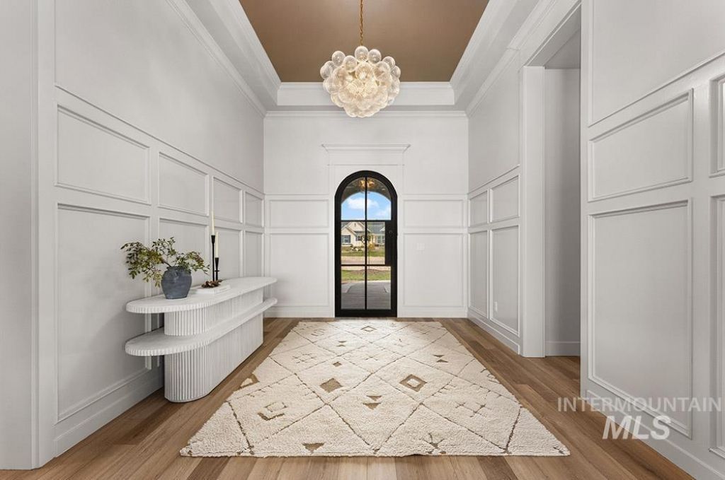 A striking custom single-level home by Story Builders, set on a private one-acre lot with sweeping, unobstructed views and no rear neighbors. This exceptional property features a massive covered patio, 40X12 RV garage, and magazine-worthy craftsmanship throughout. Inside, a light-filled open-concept layout showcases black grid-lined windows, designer fixtures, and rich wood flooring. The gourmet kitchen is a true centerpiece, complete with quartz countertops, ceiling-height two-toned cabinetry, classic subway tile backsplash, and premium SS appliances. The impressive walk-in pantry functions as a second kitchen, offering dual Thermador ovens, a second dishwasher, prep sink, and abundant cabinetry. The dining room is fully wrapped in grid-lined windows while the spacious great room is designed for effortless everyday living. The luxe master retreat features a spa-inspired bath with a freestanding soaking tub with a floor-mounted faucet, dual quartz vanities, frameless glass walk-in shower, & direct laundry access. Enjoy the expansive acre lot with a large covered outdoor living space, lush lawn, and serene open space beyond. Located in Middleton, known for top-rated schools, generous lot sizes, and authentic small-town Idaho living, all just 25 minutes from downtown Boise. Benefit from low property taxes and easy access to outdoor recreation!